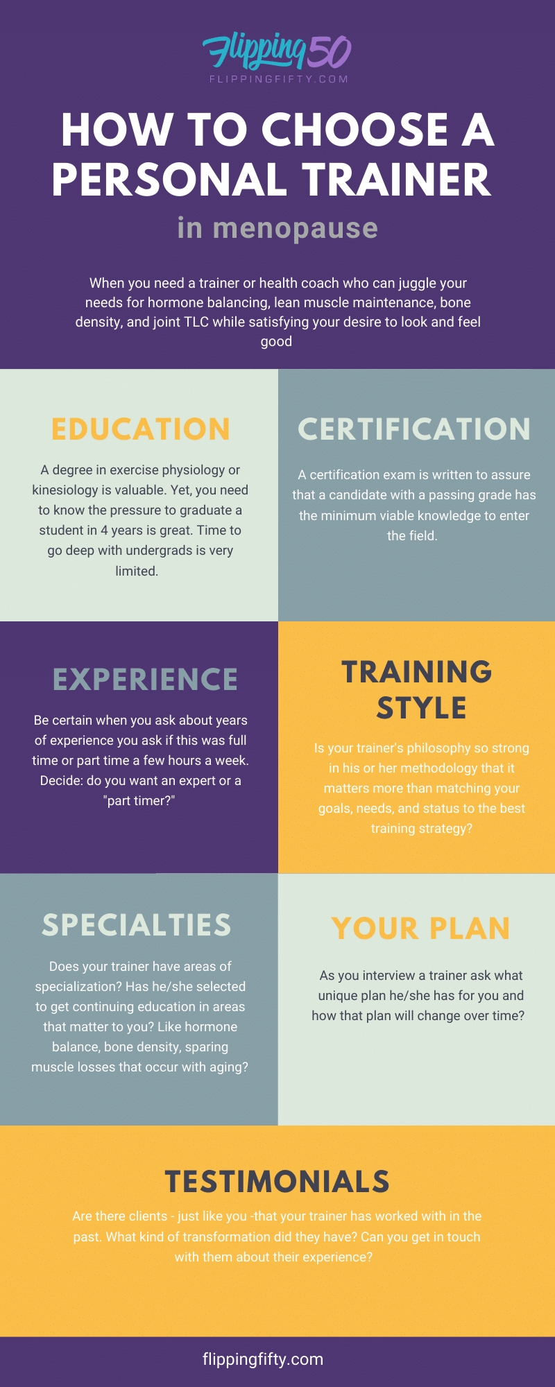 Women in midlife deserve better. This post is an update from an earlier post I felt called to write after coming across a very disturbing post from a (male) personal trainer online. In this update, I provide a detailed list of questions and infographic to remind you what you really should ask a trainer or